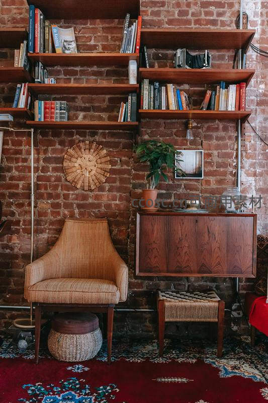 红砖墙书房角落,藤椅与木质书架相映成趣