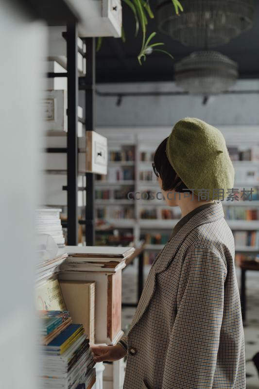 戴绿帽女子在书店选书,文艺气息扑面而来