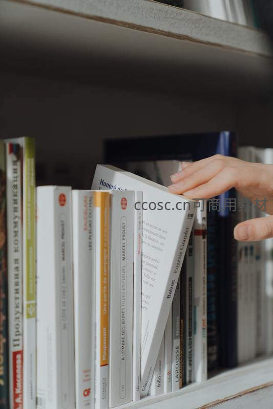 一只手正从书架上抽出一本封面为白色的文学作品,书页微微翻开,露出内文。这个动作象征着即将开始的一段精神之旅,充满了期待与对知识的渴望。