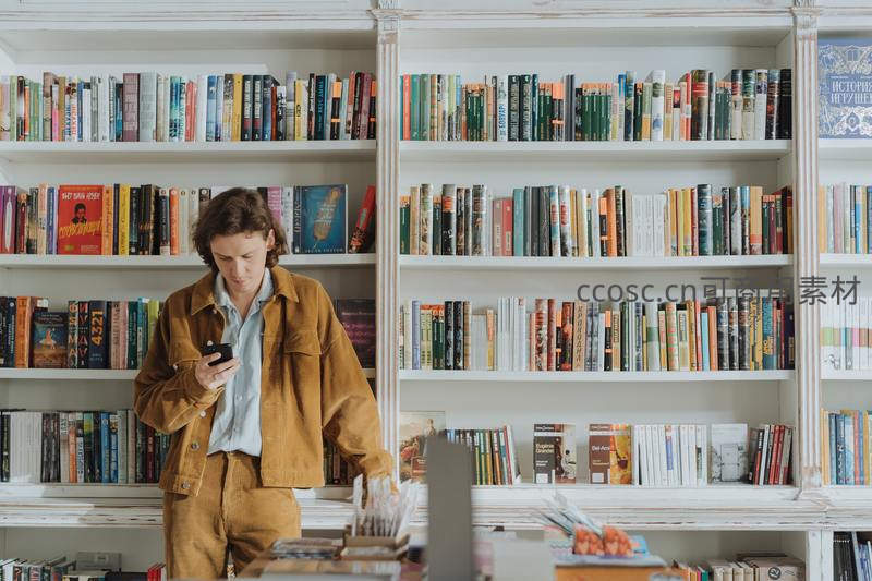 一位年轻男子站在满是书籍的白色书架前,低头专注地看着手机,周围环境安静而充满书香气息,展现了现代人与传统阅读空间的交融。