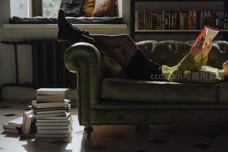 女子悠闲地躺在绿色皮沙发上,脚搭窗台,手捧红书,身旁堆叠着书籍,阳光透过窗户洒入,尽显惬意与舒适。