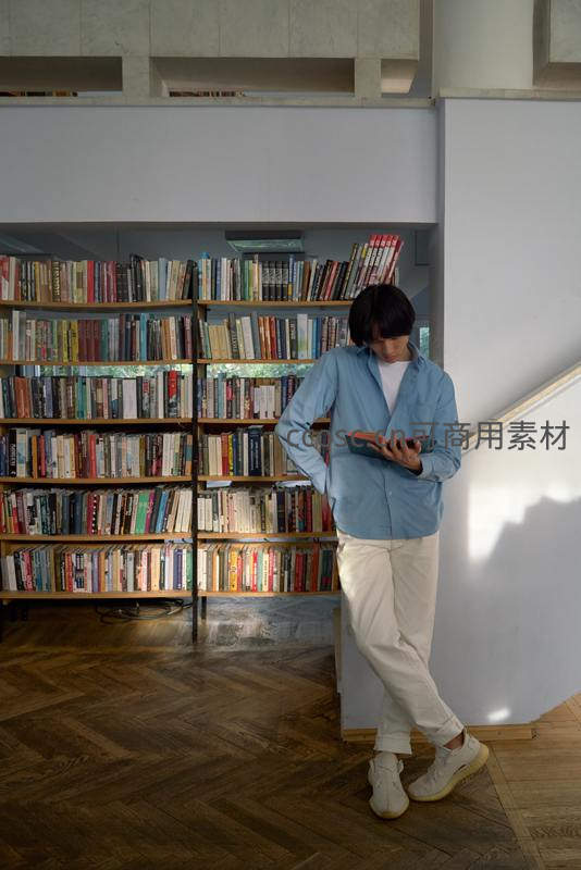 一位年轻男子靠在图书馆的白色墙壁旁,手中捧着书专注阅读,身后是装满书籍的书架和木质地板,自然光勾勒出宁静的阅读时光。