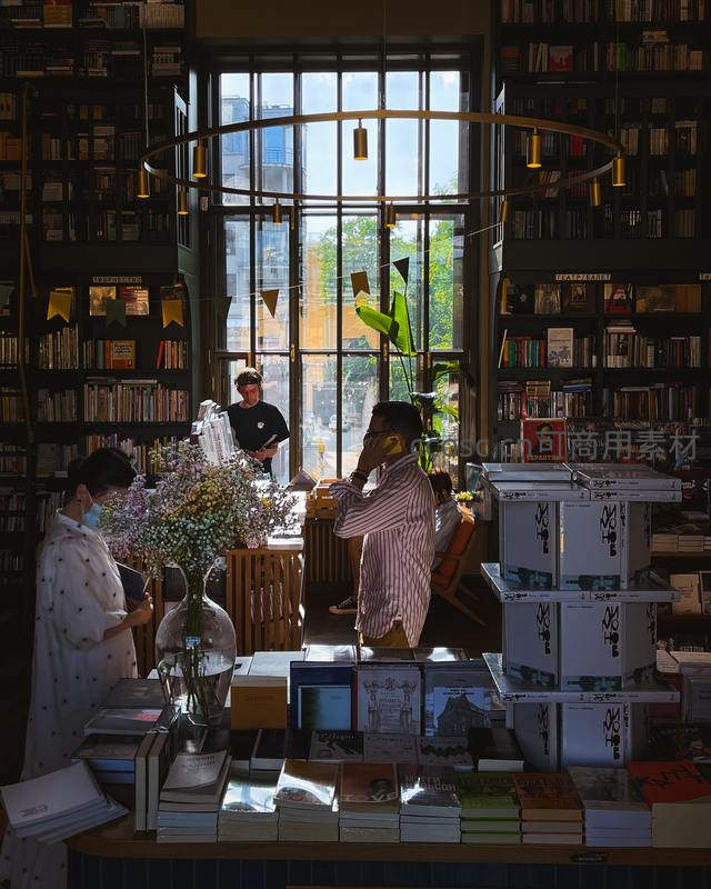 巨大的落地窗将明媚阳光引入店内,顾客在花瓶旁的书堆中驻足挑选,圆形吊灯与绿植点缀其间,构成一幅温馨惬意的阅读画卷。