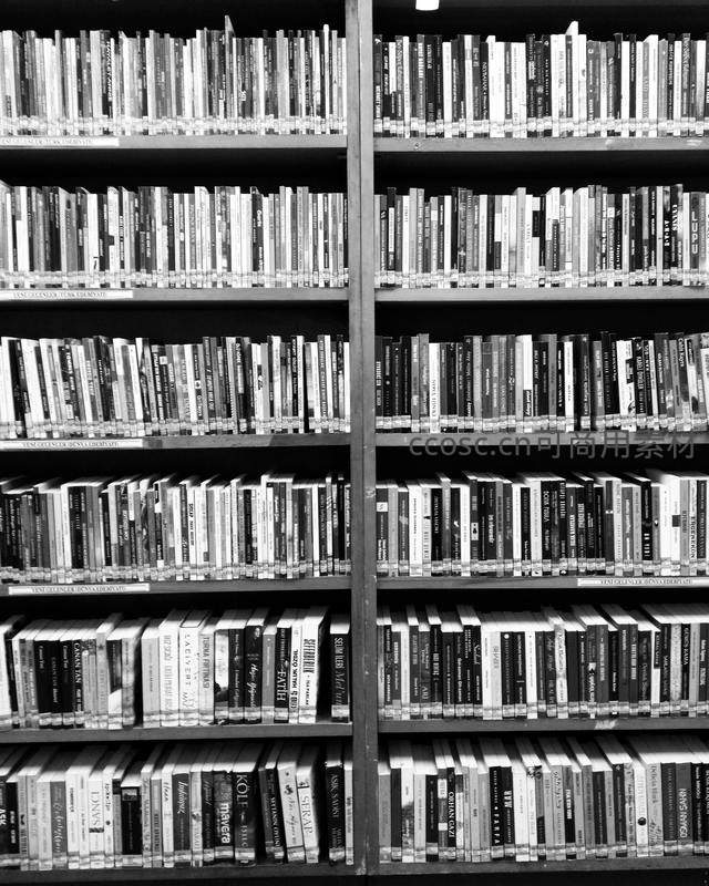 黑白书架满载知识,静谧有序排列