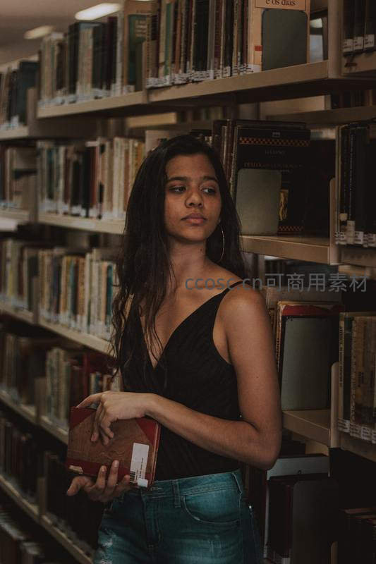 一位长发少女站在图书馆高大的书架间,手中捧着一本红色封面的书,眼神专注而宁静,周围是整齐排列的书籍。