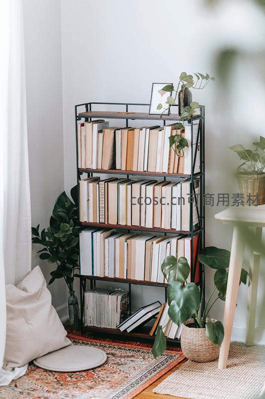 绿植环绕的温馨书架角落
