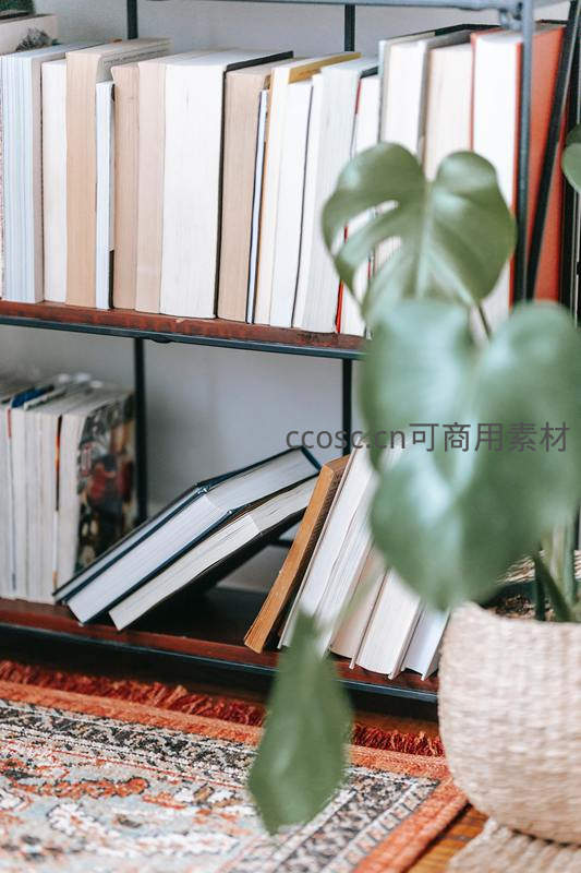 镜头聚焦于书架一角,一片翠绿的龟背竹叶从书丛中伸展而出,柔和的光线洒在书页与叶片上,展现阅读空间中的自然诗意。