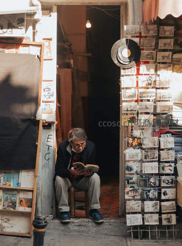 一位戴眼镜的老人坐在街边小摊门口,专注阅读手中书籍。周围挂满明信片与黑胶唱片,阳光穿过缝隙,营造出温暖而宁静的怀旧氛围。