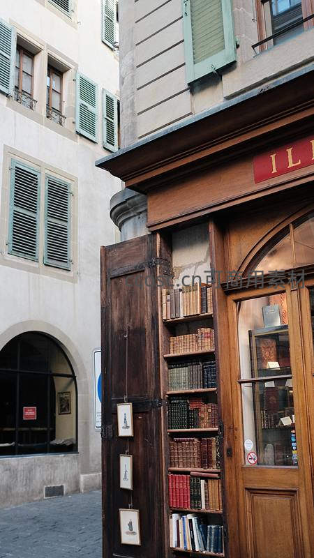 一座位于欧洲老城街角的复古书店,深色木门敞开,露出满架经典书籍,青绿色百叶窗与石墙相映成趣,营造出静谧而富有文化底蕴的阅读氛围。
