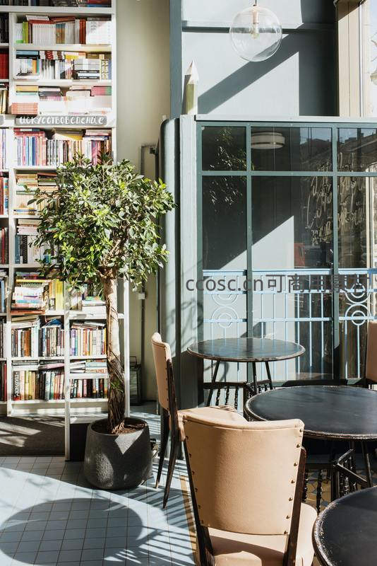 阳光洒落的书店角落,绿植与书架相映成趣