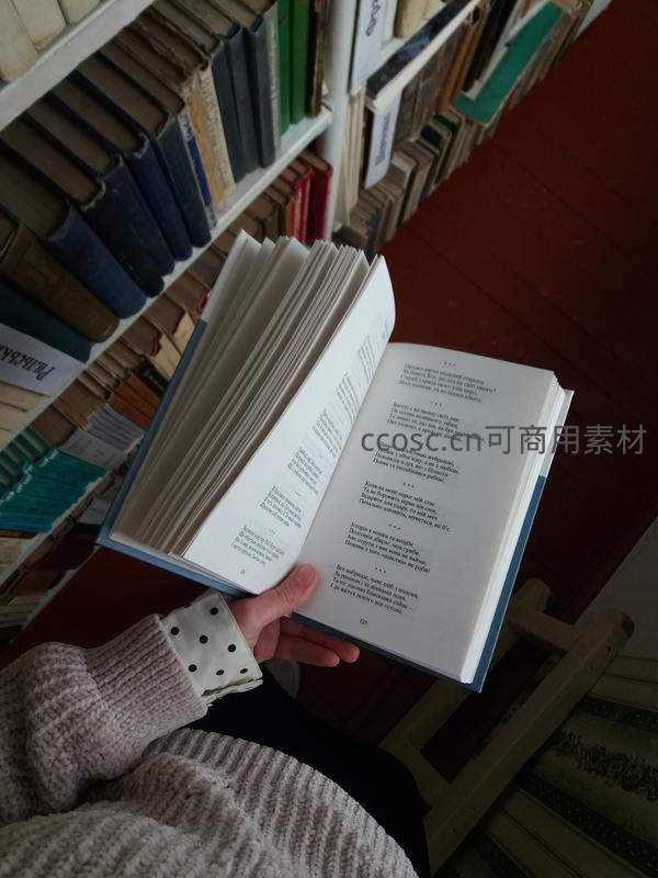 双手捧着一本打开的厚书,字里行间流淌着思想的光芒,周围是整齐的书架,营造出专注阅读、汲取智慧的宁静时刻。