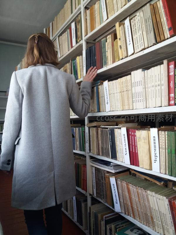 女子背影在图书馆书架间挑选书籍