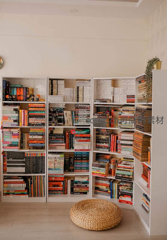 现代简约风格的客厅角落,白色书架满载书籍