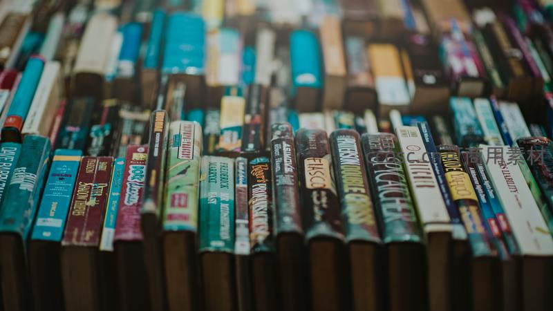 近距离拍摄的书架上,一排排书脊紧密排列,色彩斑斓,文字清晰可见,营造出浓厚的知识氛围和视觉美感。