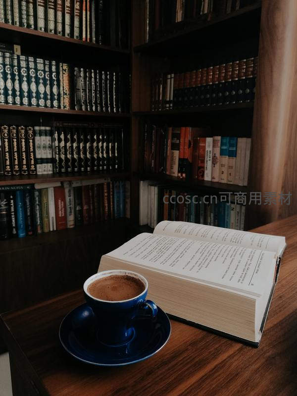 一杯热咖啡置于摊开的书旁,背景是满载典籍的深色木书架,营造出宁静专注的阅读氛围,适合学习与沉思。