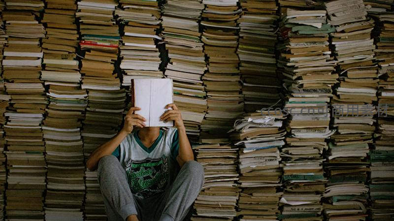 一个人坐在高耸的书堆中间,用一本书遮住脸庞,仿佛在浩瀚的知识海洋中寻找宁静与答案,周围是层层叠叠的旧书。