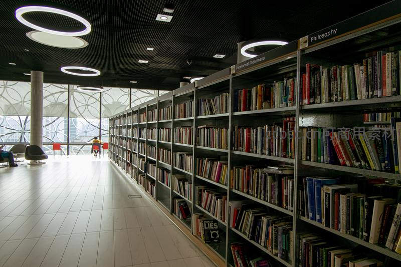 哲学区书架旁环形灯饰与通透落地窗景