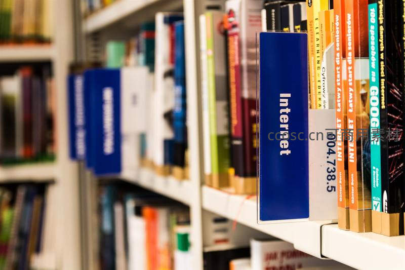 特写镜头聚焦于图书馆书架上的蓝色分类标签,清晰显示“Internet”字样,周围排列着相关主题书籍,体现现代知识体系的有序分类。