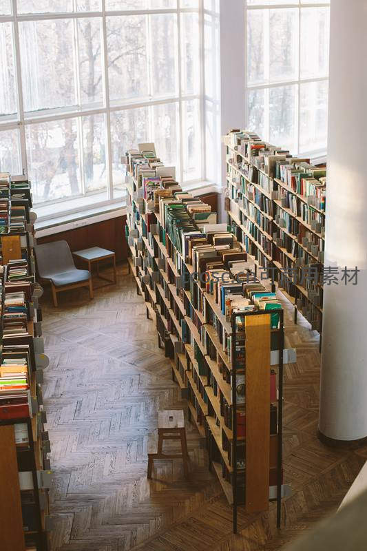 从高处俯瞰,图书馆的书架如迷宫般延伸,阳光在人字形木地板上投下斑驳光影,空旷的阅读区静待读者前来探索知识的海洋。