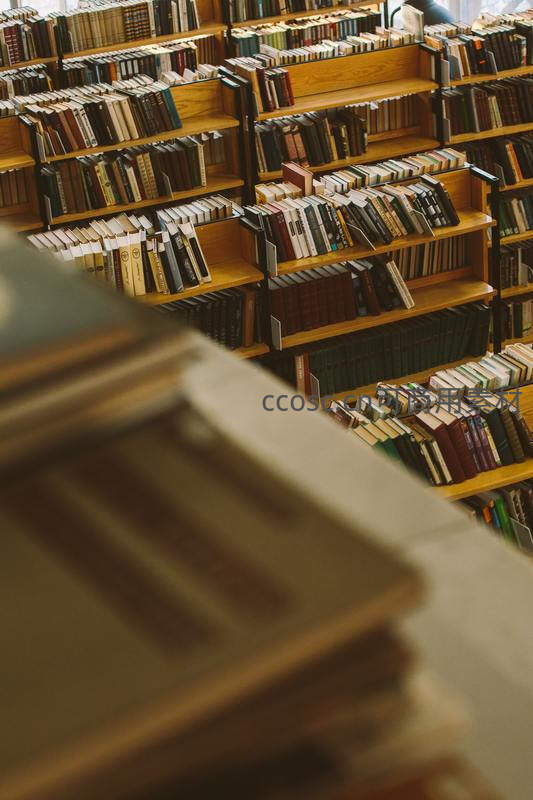 前景虚化书本,聚焦后方层层叠叠的书架