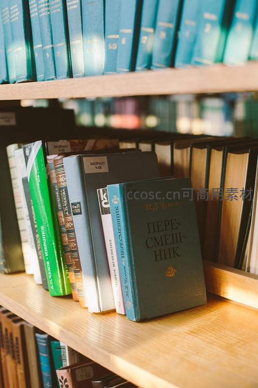 木质书架上的蓝色经典书籍特写