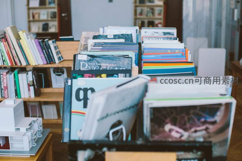 图书馆一角,多本色彩鲜艳的杂志和书籍被整齐地摆放在展示架上,背景是模糊的书架,充满了浓厚的文化与知识探索气息。