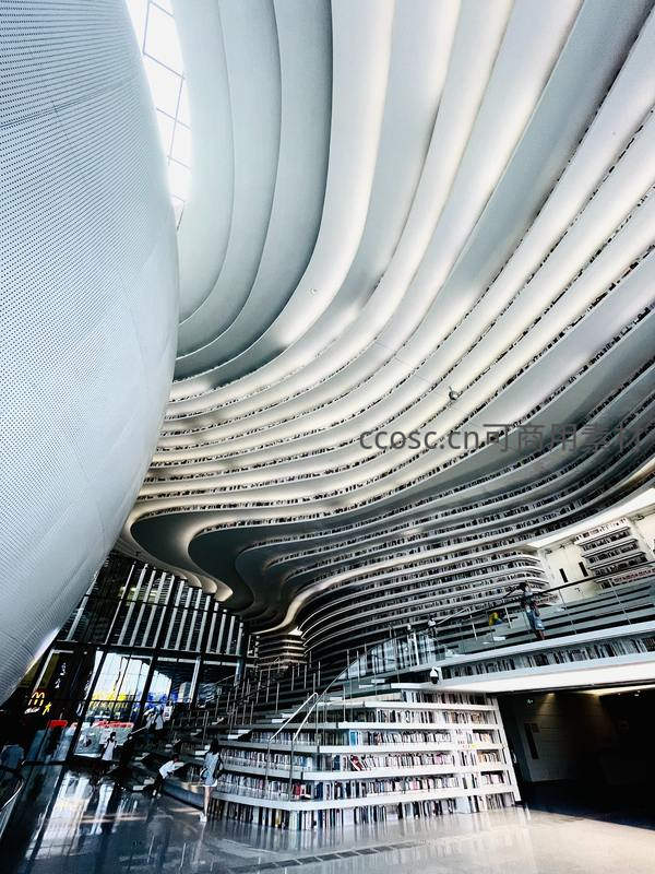 极具未来感的图书馆内部,波浪形的天花板与层叠书架相映成趣,展现出现代建筑设计的创新与美学魅力。