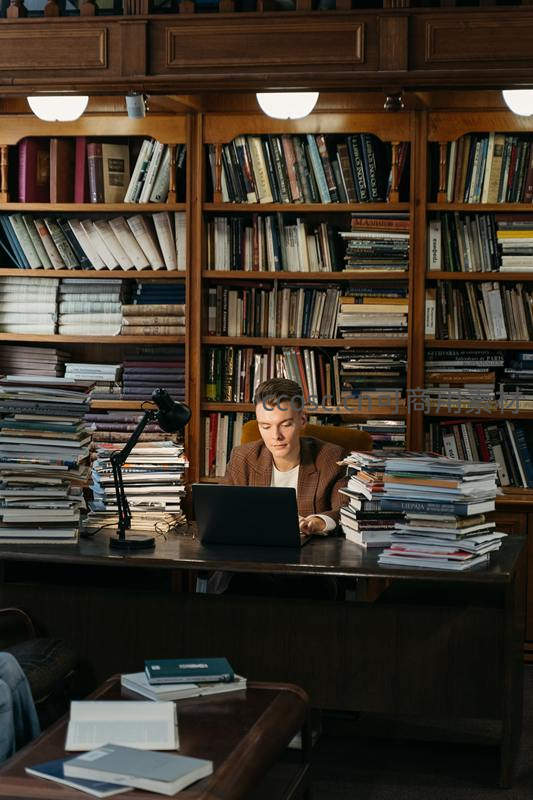 年轻学者坐在堆满书籍的书桌前,利用笔记本电脑进行研究,周围是如山的文献资料,体现了现代学术工作的场景。