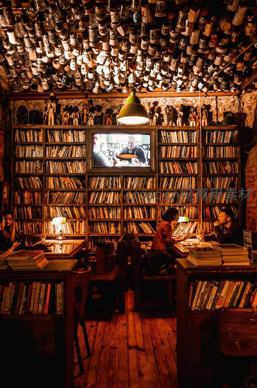 天花板挂满酒瓶,墙壁嵌满书籍,暖黄灯光下人们围坐桌旁阅读或交谈,电视播放着影片,营造出兼具文艺与市井气息的独特阅读空间。