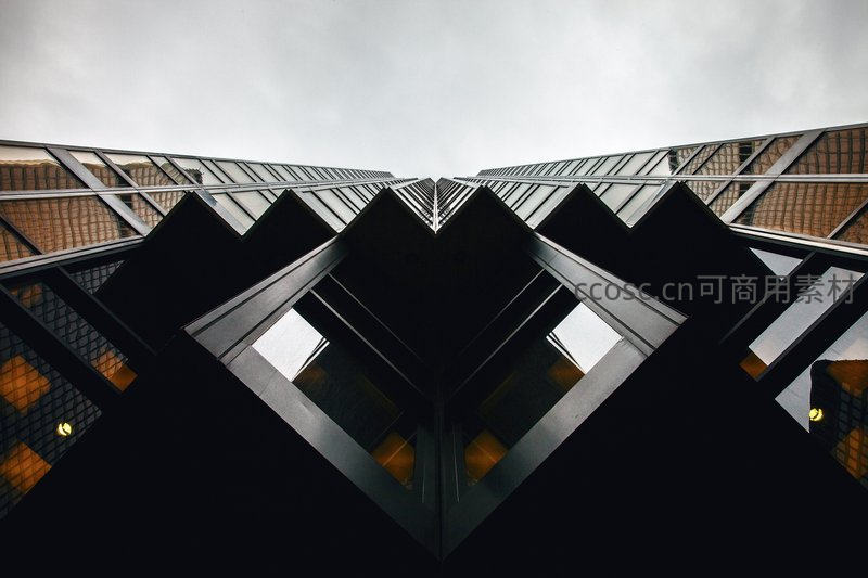以中心对称的仰视角度拍摄高楼,其锐利的棱角和深邃的阴影创造出强烈的视觉冲击力,展现了现代建筑结构的力量与秩序之美。