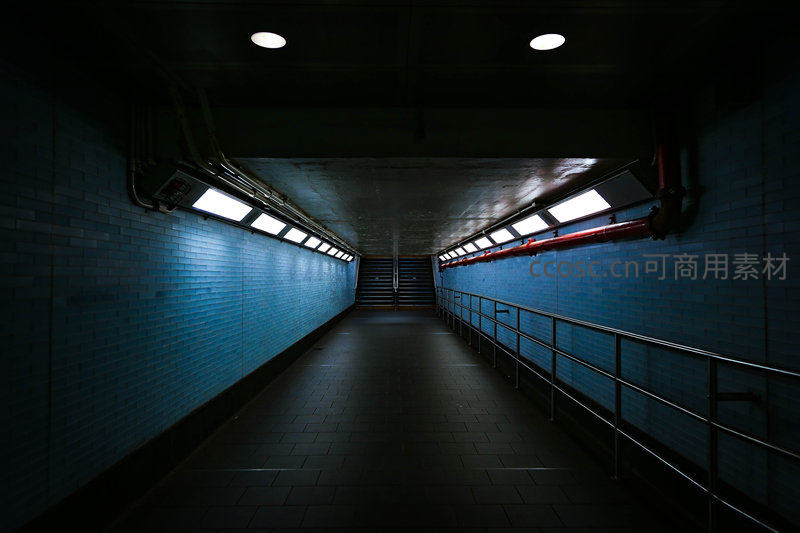 蓝色瓷砖隧道尽头阶梯微光