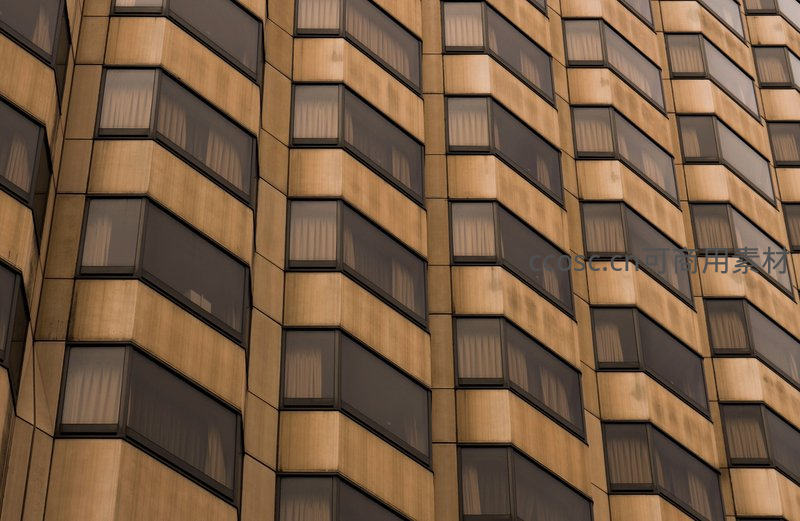 金色外墙的高楼立面,窗户以规律的锯齿状排列,形成强烈的视觉节奏感,体现现代都市建筑的秩序美与材质质感。