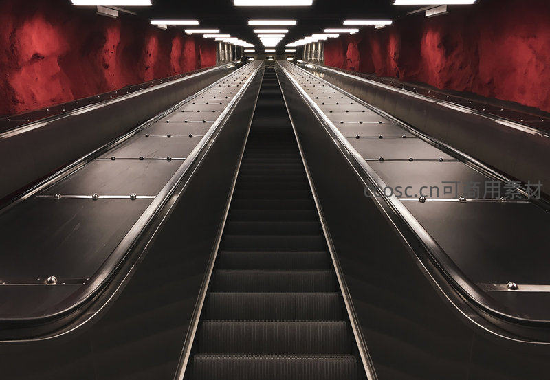 红色岩壁隧道中的自动扶梯