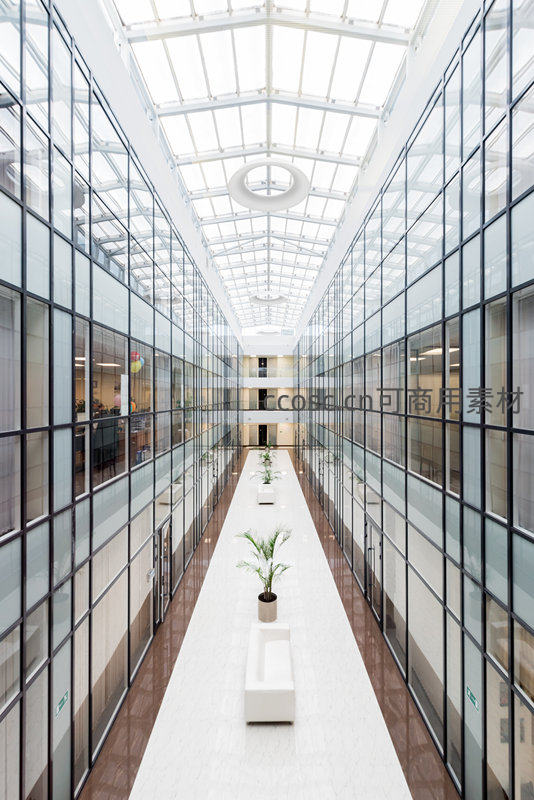 玻璃幕墙中庭的现代办公长廊