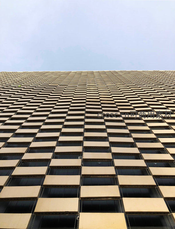 以低角度仰望一栋覆盖着金色格栅幕墙的高楼,整齐排列的窗框与天空形成强烈视觉冲击,展现现代建筑立面设计的节奏与韵律之美。