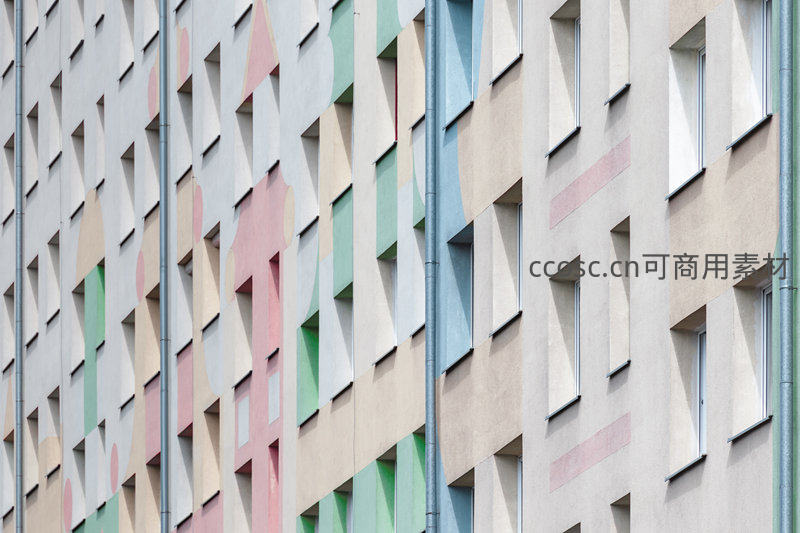 建筑外墙采用粉色、绿色、蓝色等柔和色彩填充不规则几何凹槽,搭配规整窗户,创造出富有童趣与艺术感的视觉效果,打破传统建筑的单调印象。