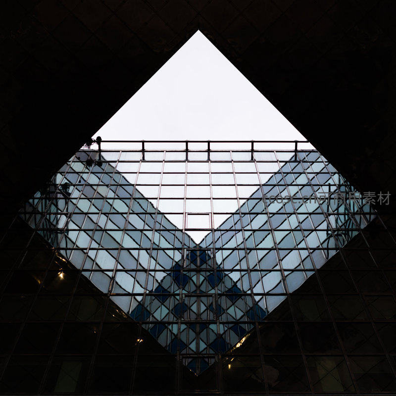 从室内仰望标志性的玻璃金字塔天窗,阳光透过菱形玻璃格栅洒下,形成复杂的光影图案,其完美的对称结构与天空构成一幅现代建筑美学画卷。