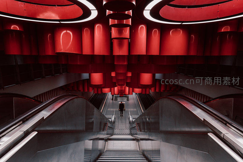 一个被鲜红圆柱体和环形灯带包围的未来感地铁站大厅,中央扶梯上一个渺小的身影,强烈的色彩与对称构图突显了空间的宏伟与人的孤独感。