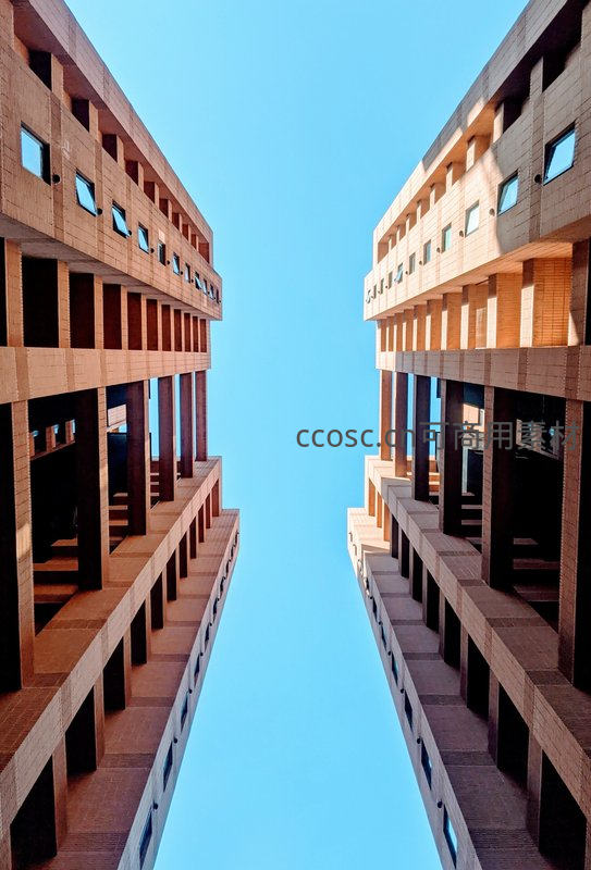 两座对称的砖砌建筑从底部向上延伸,在蔚蓝天空的映衬下形成一个完美的V形构图,突出了建筑的体量感和空间的纵深感。
