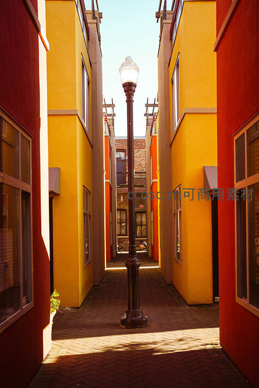 一条被阳光照亮的狭窄巷道,两侧是鲜艳的黄色和红色建筑,中央矗立着一盏古典风格的路灯,地面铺着整齐的砖块,营造出宁静而富有艺术感的都市角落。