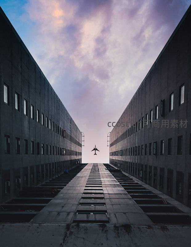 在两排高耸的废弃混凝土厂房之间,一架飞机正从远方飞过,头顶是绚丽的粉紫色晚霞。强烈的对称构图与冷峻的工业感形成视觉冲击,充满未来科幻气息。