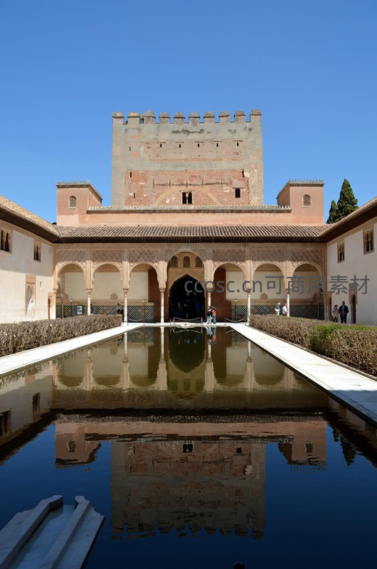 一座古老城堡的内庭,清澈水池完美倒映出蓝天、白云和雄伟的塔楼。两侧回廊拱门环绕,游客漫步其间,古典建筑与自然光影交织,尽显历史厚重与宁静之美。