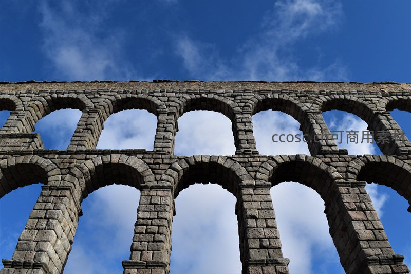宏伟的古罗马式石拱桥横跨天际,石块纹理清晰,拱形结构对称优美,在蔚蓝天空与朵朵白云映衬下更显庄重与沧桑。