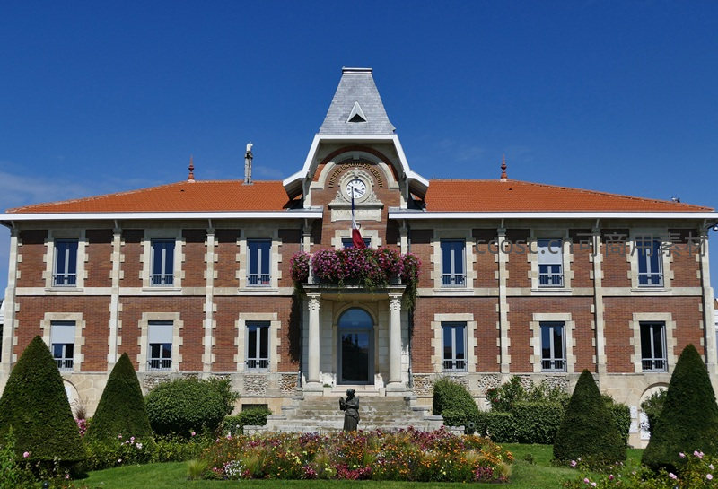 红砖白石相间的法式古典市政厅庄严矗立,门前阶梯两侧鲜花盛放,修剪整齐的绿植与蓝天呼应,尽显欧洲小镇的优雅与宁静。