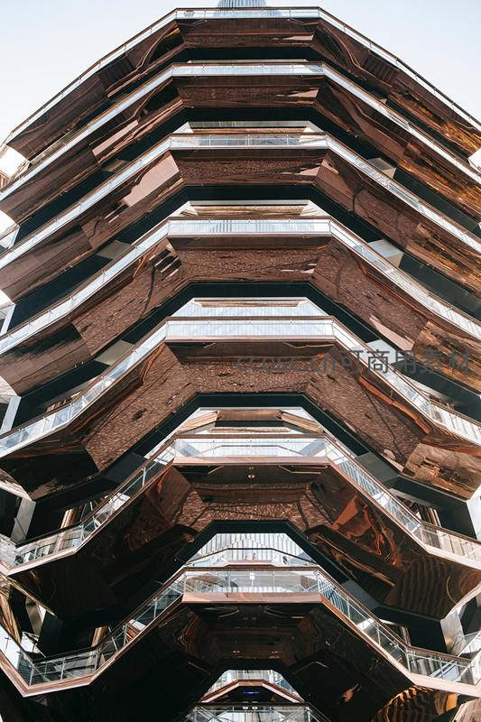 从低角度仰望,这座独特的阶梯式建筑外墙由反光铜色金属板构成,层层叠叠,充满未来感和雕塑般的艺术气息,是城市天际线的新地标。
