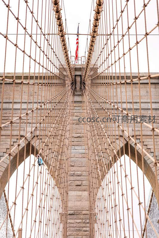 从桥底仰望,密集的悬索与石砌塔楼构成宏伟的视觉框架,顶端飘扬的星条旗为这座工业时代的杰作增添了国家象征。