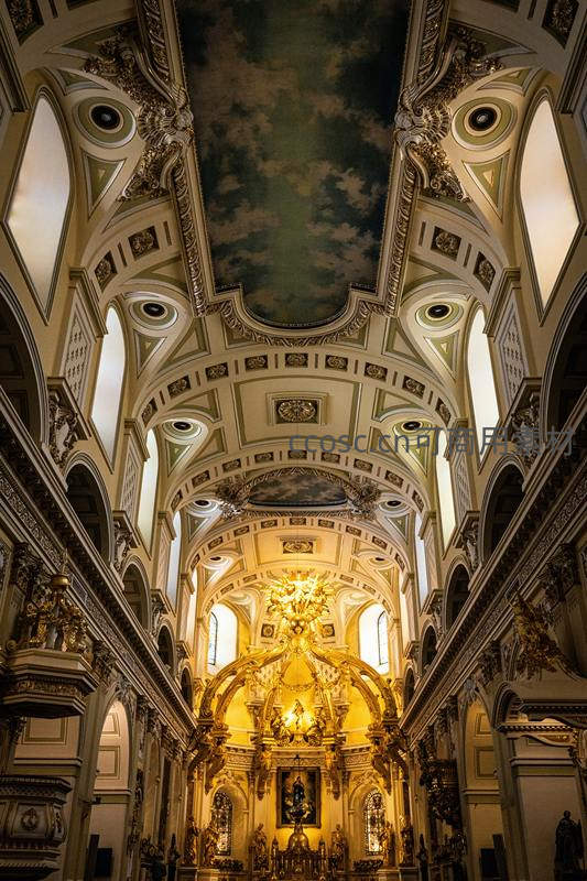 金碧辉煌的祭坛与繁复的浮雕装饰着高耸的穹顶,天花板上的云彩壁画仿佛通向天国,尽显古典宗教建筑的恢弘与精致。