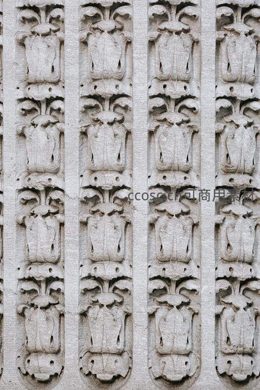 垂直排列的石雕装饰图案,呈现重复对称的植物或几何形态,表面略带风化痕迹,彰显古典建筑工艺之美,适合作为背景纹理使用。