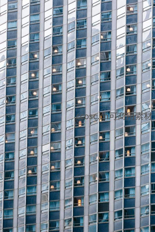 夜晚酒店窗内暖光点缀幕墙