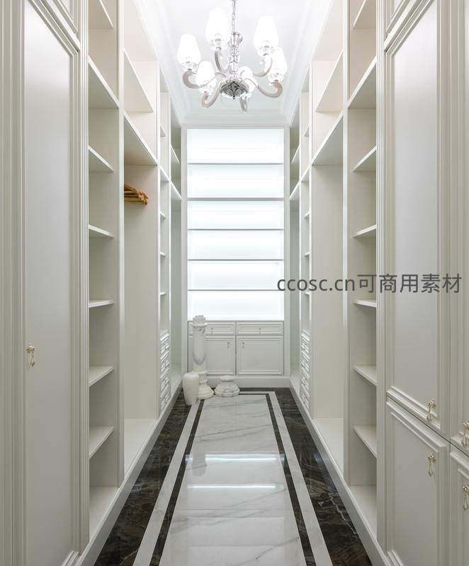 一条明亮整洁的白色衣帽间长廊,两侧是定制衣柜,地面铺设黑白相间的大理石,尽头是大窗户和精致水晶吊灯,尽显奢华。